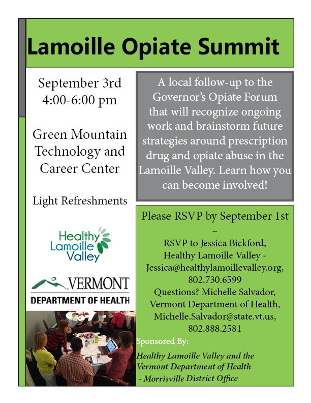 A Summit on opiates? Is this for you? Yes – the reality is that opiates, and other drugs, impact almost every sector of our lives in beautiful Lamoille Valley (Belvidere, Cambridge (including Jeffersonville), Craftsbury, Eden, Elmore, Greensboro, Hardwick, Hyde Park, Johnson, Morristown, Stannard, Stowe, Waterville, Wolcott, Woodbury). Drug misuse crosses cultural and economic boundaries. It disrupts schools, families, and work environments, often quietly extracting its toll from individuals and families before it splashes in disrupting the lives of everyone in the surrounding pond.